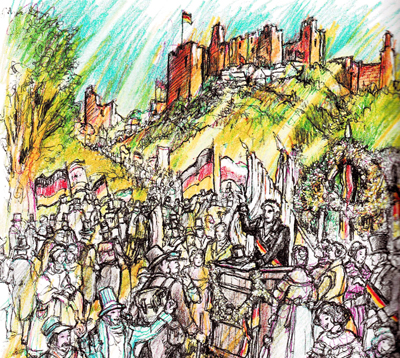 Hambacher Fest 1832: Illustration von Volker Schmidt-Gliaugir aus dem Buch "Demokratisch bis zum Anschlag".